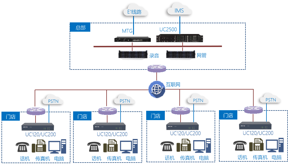 1.部署灵活,维护简单各门店部署一台UC200, 可支持接入模拟和IMS线路;2.集中管理总部可以集中管理所有门店的通话记录和录音等,深度挖掘客户需求、考核门店业绩、了解客户满意度;3.内部通信总部和各门店以及门店之间可相互相同,高效沟通。